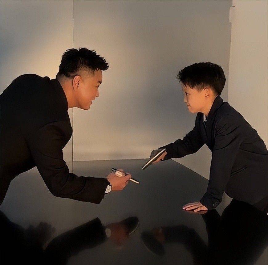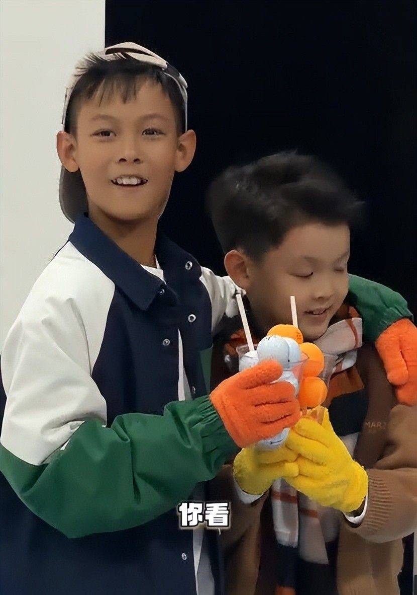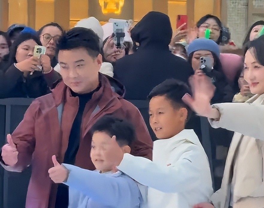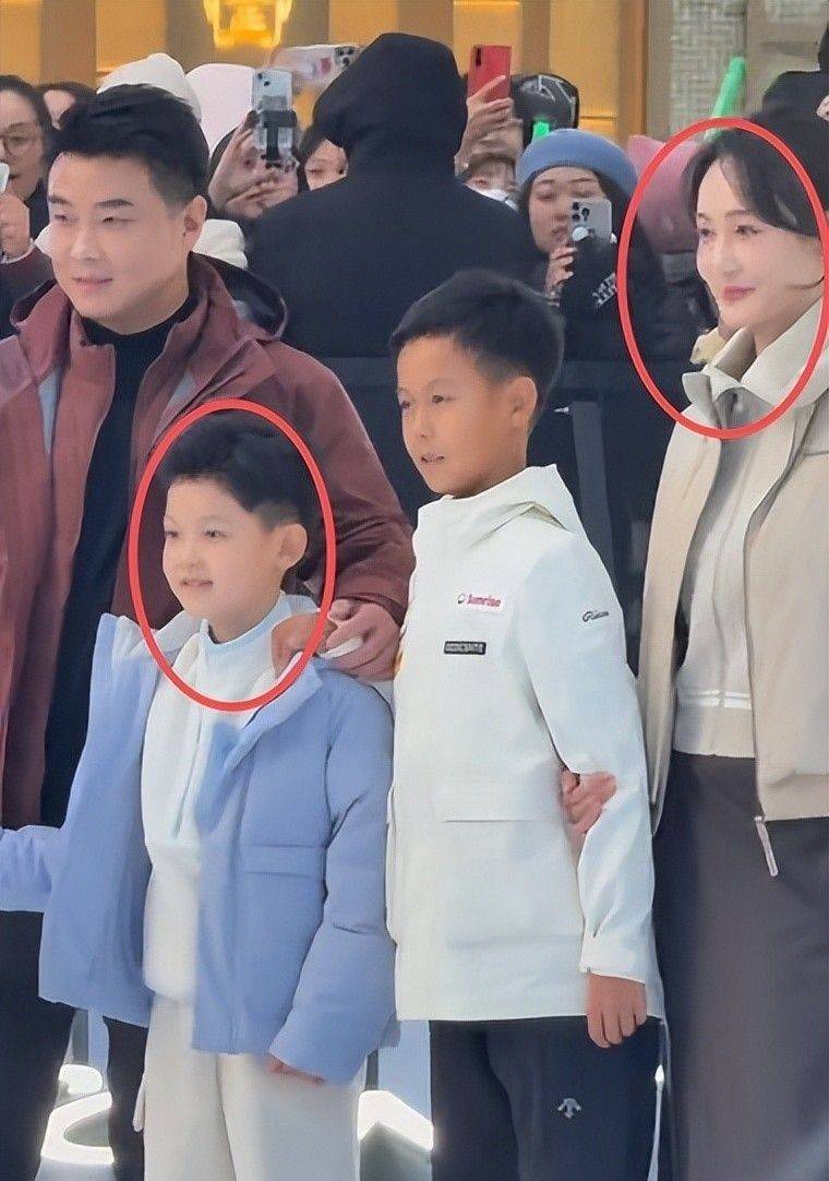 两个儿子的表现同样吸睛十足。大儿子王睿霖年仅12岁,身高已接近母亲肩头,身穿一套藏蓝色正装西服,内搭洁白衬衫,小领带系得一丝不苟。